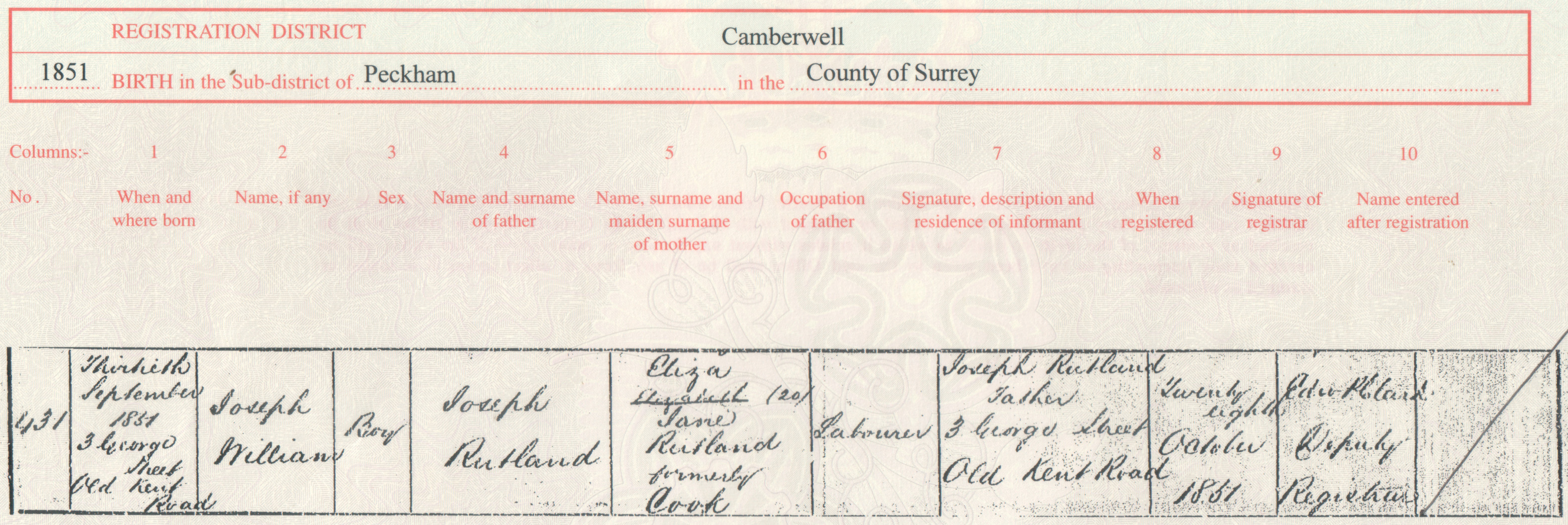 Rutland was born at 3 George Street, Old Kent Road, Peckham, Camberwell, Surrey