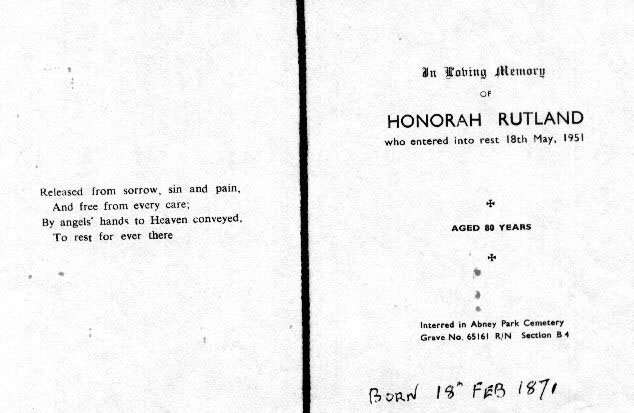 Joseph William Rutland was born on June 1, 1869 at 11 Stockwell Street, Old Kent Road, London. He worked as a French Polisher and married Honora O'Brien (b. February 18, 1871) on July 27, 1890 at the Parish Church of Christ Church, Spitalfields, London. Honora (sometimes spelt 'Honorah', 'Nora' or 'Norah') was the daughter of Joseph and Catherine (nee McGuire) O'Brien.