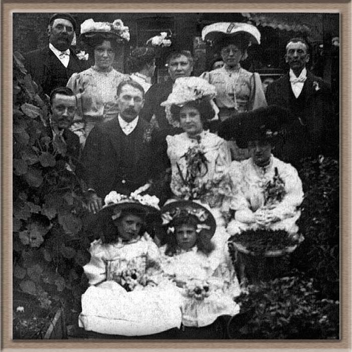 Fred & Lydia's Wedding party - Aug. 11, 1907. George Arthur Leggett is to the left of Fred Butler. Lydia's mother, Annie is standing behind her, and father Francis John is in the top right of the picture. |