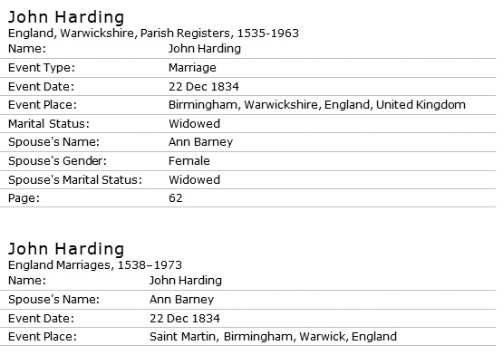 A further complication exists in that due to both Richard and Ann's relatively mature ages at the time of the birth of their first child (Susannah) in 1817 (Richard approx 35 years old, and Ann bet.26-30), it's not possible to rule out the possibility that one or both of them had previously married. Richard and Ann's marriage record, if it can be located, would indicate whether either of them were widowed. If true in Ann's case, John Harding would have been her third husband.