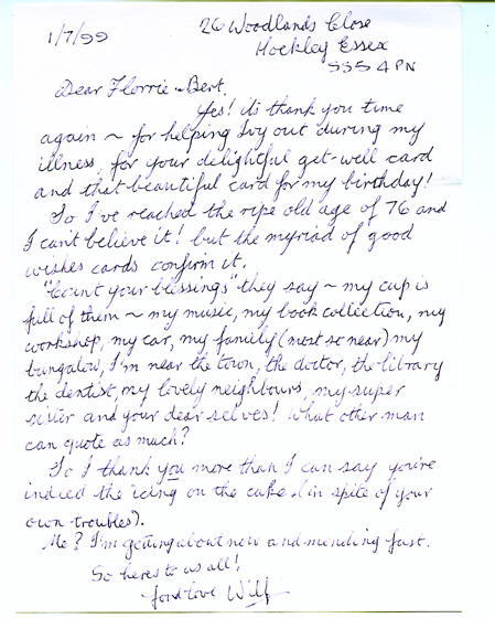 A brave letter, from Wilfred to close family friends Florrie & Bert Riches. This was just a few months after Mary's death (1st July 1999) |