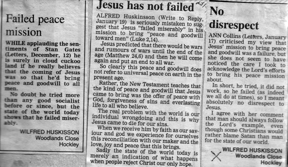 Wilfred's controversial letters and a reply, erroneously addressed to 'Alfred', from the local newspaper |