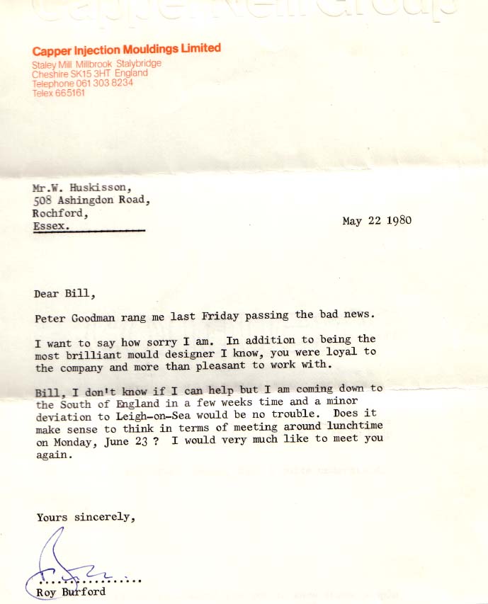 Letter from old work colleague, Roy Burford after 'Bill' was made redundant from Aladdin Plastics. |