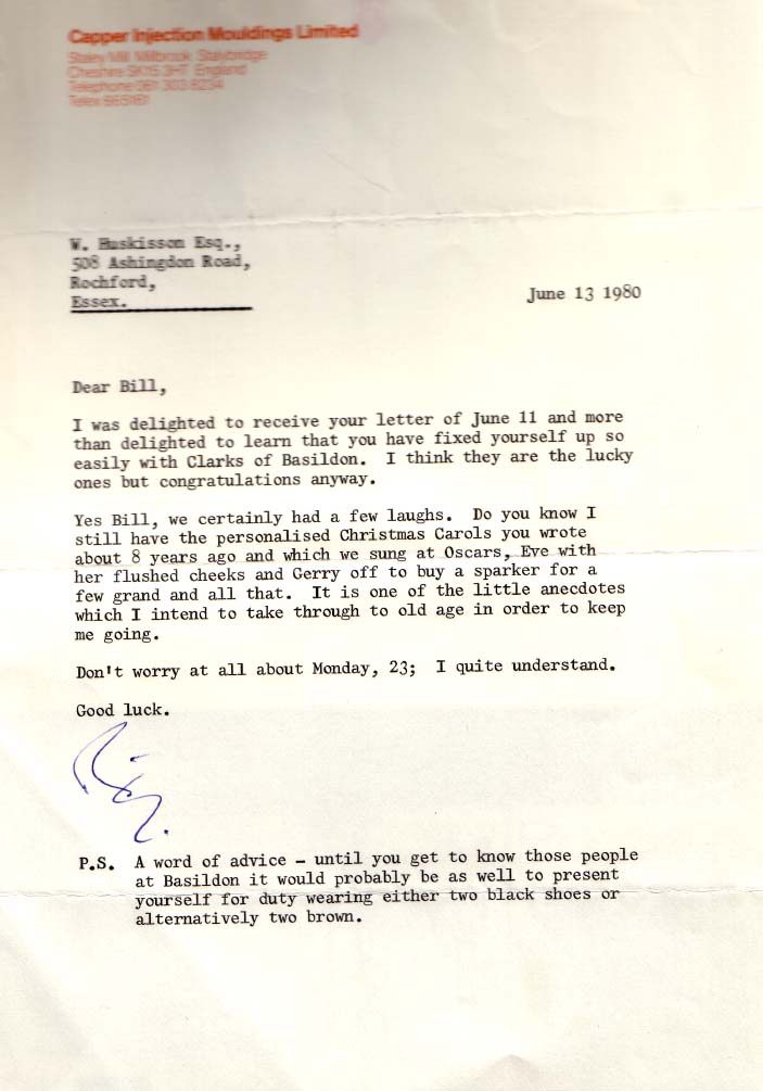2nd letter from Roy Burford congratulating 'Bill' on his new employment with 'Clarks of Basildon' |