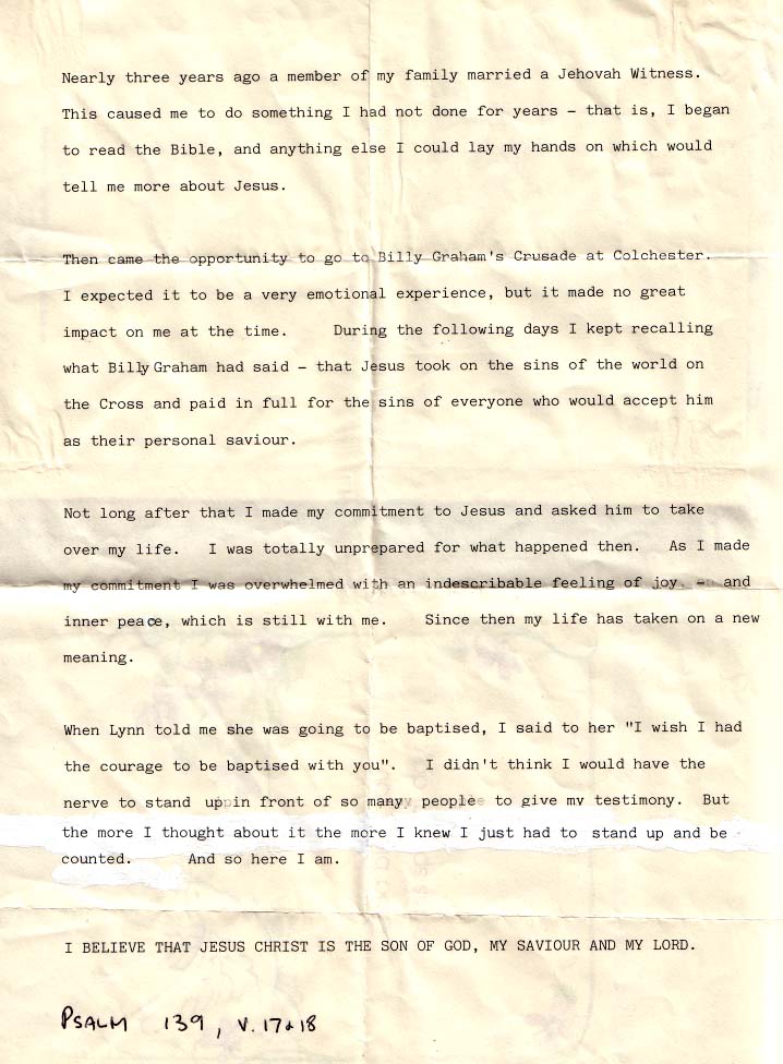 Mary's testimony which she read at her baptism in 1986 |