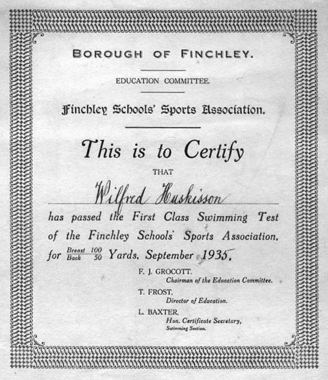 Wilfred's swimming certificate (Finchley - Sept. 1935) |