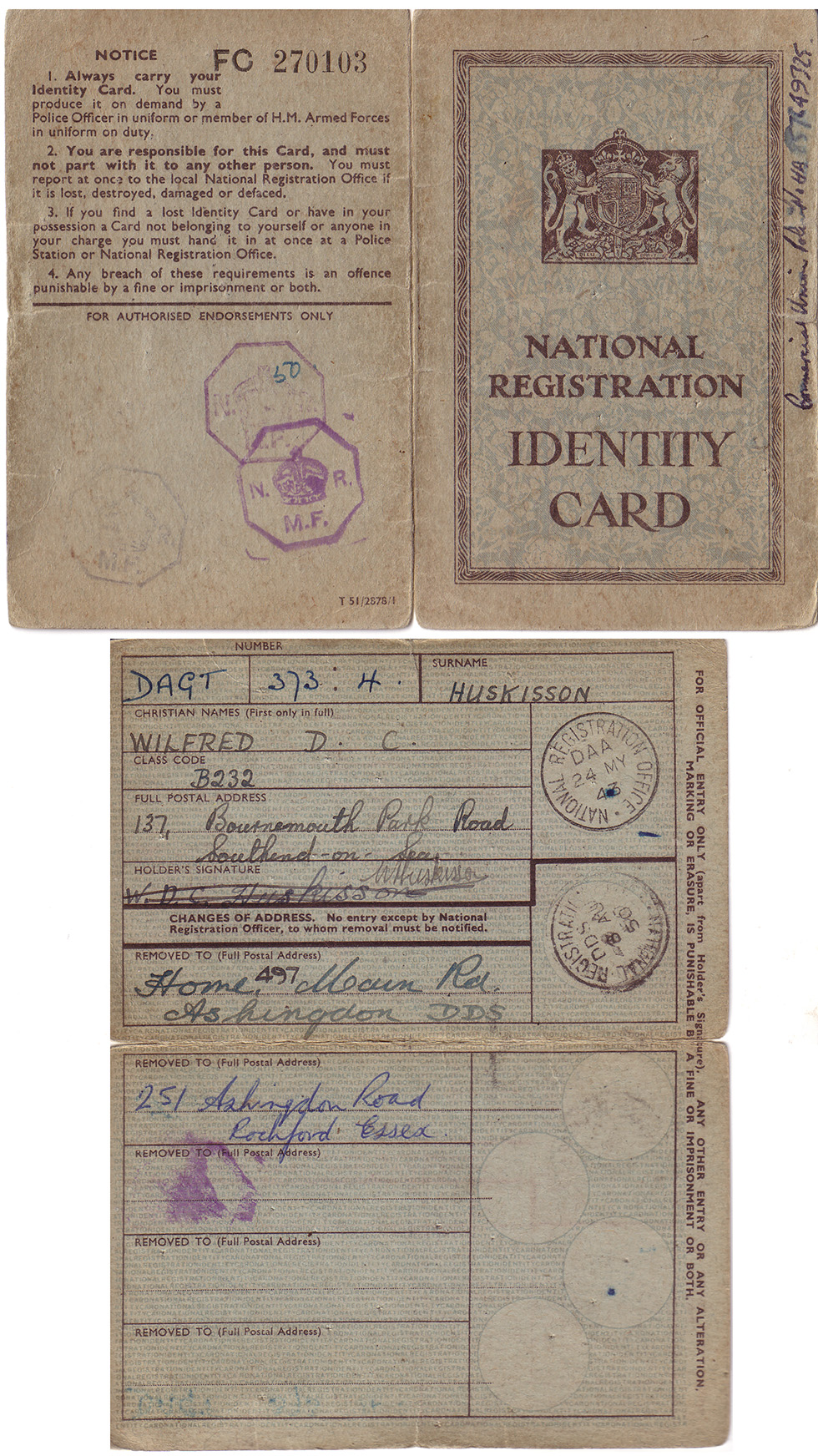![]() Wilfred's National Registration Identity Card; issued in 1943. Note that the card(s) were officially abolished on February 21, 1952. |