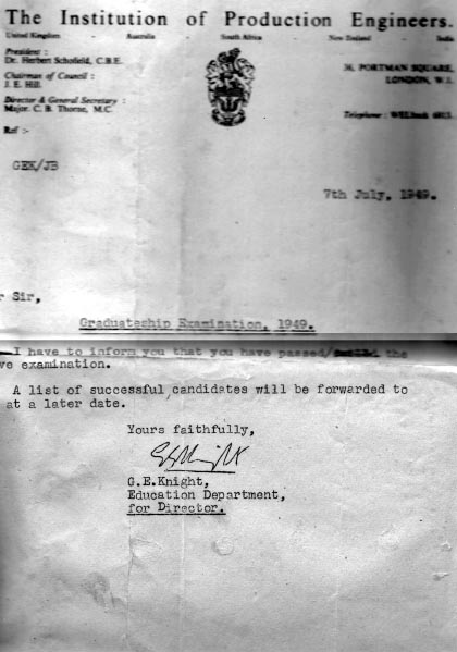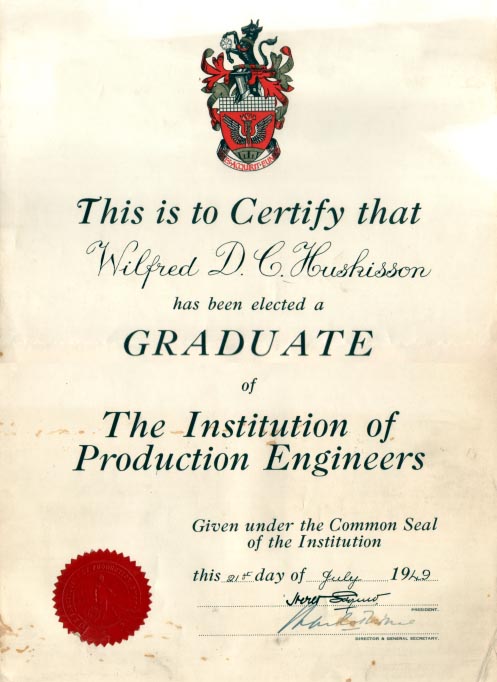 Letter of confirmation that Wilfred had become a graduate of the 'Institute Of Production Engineers' |