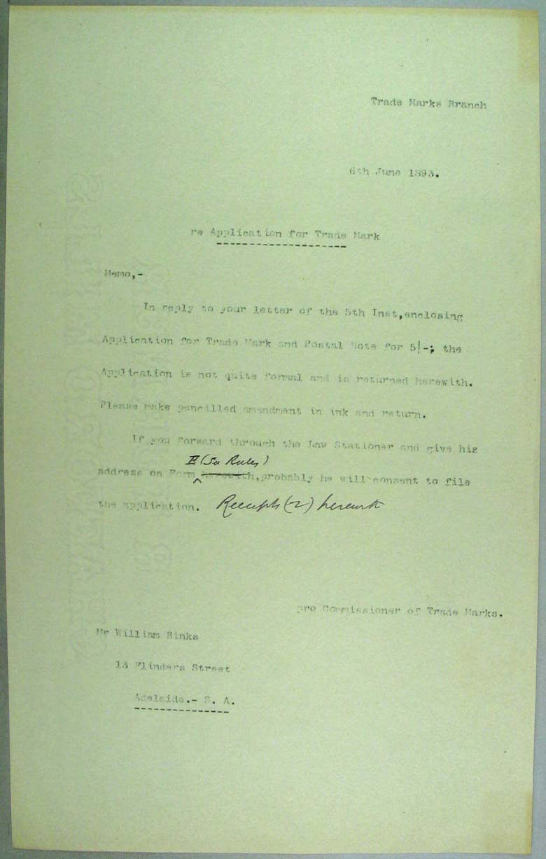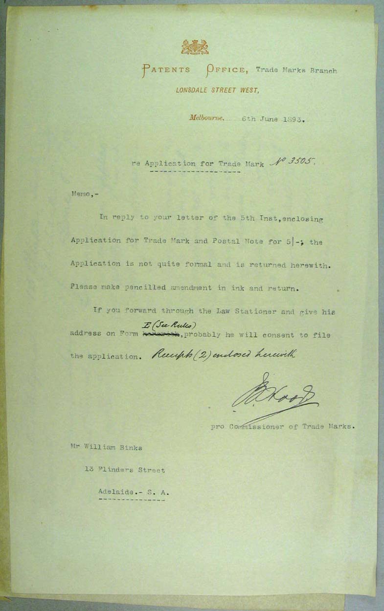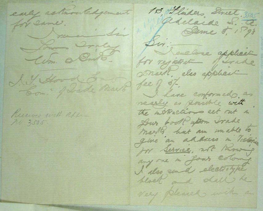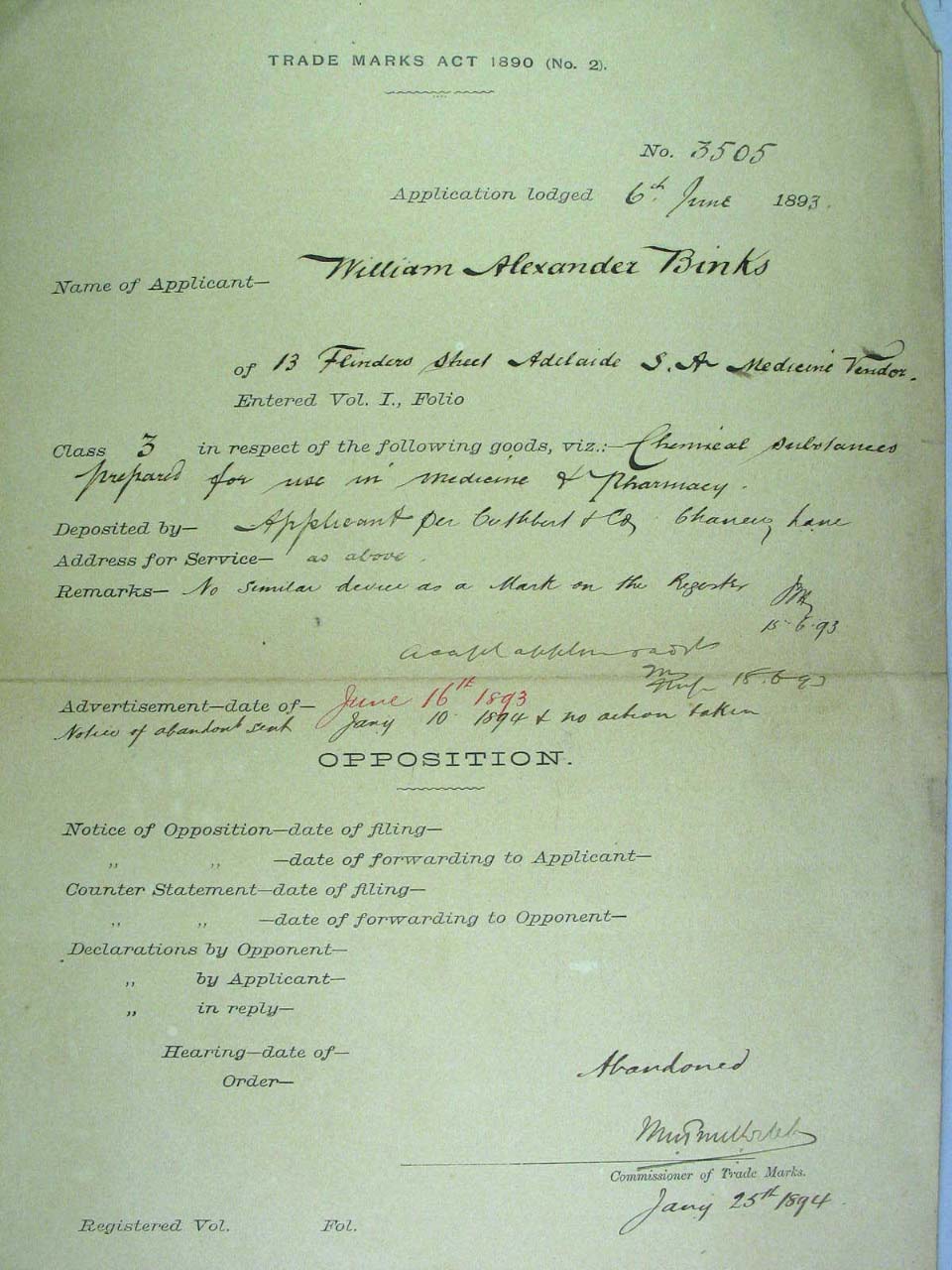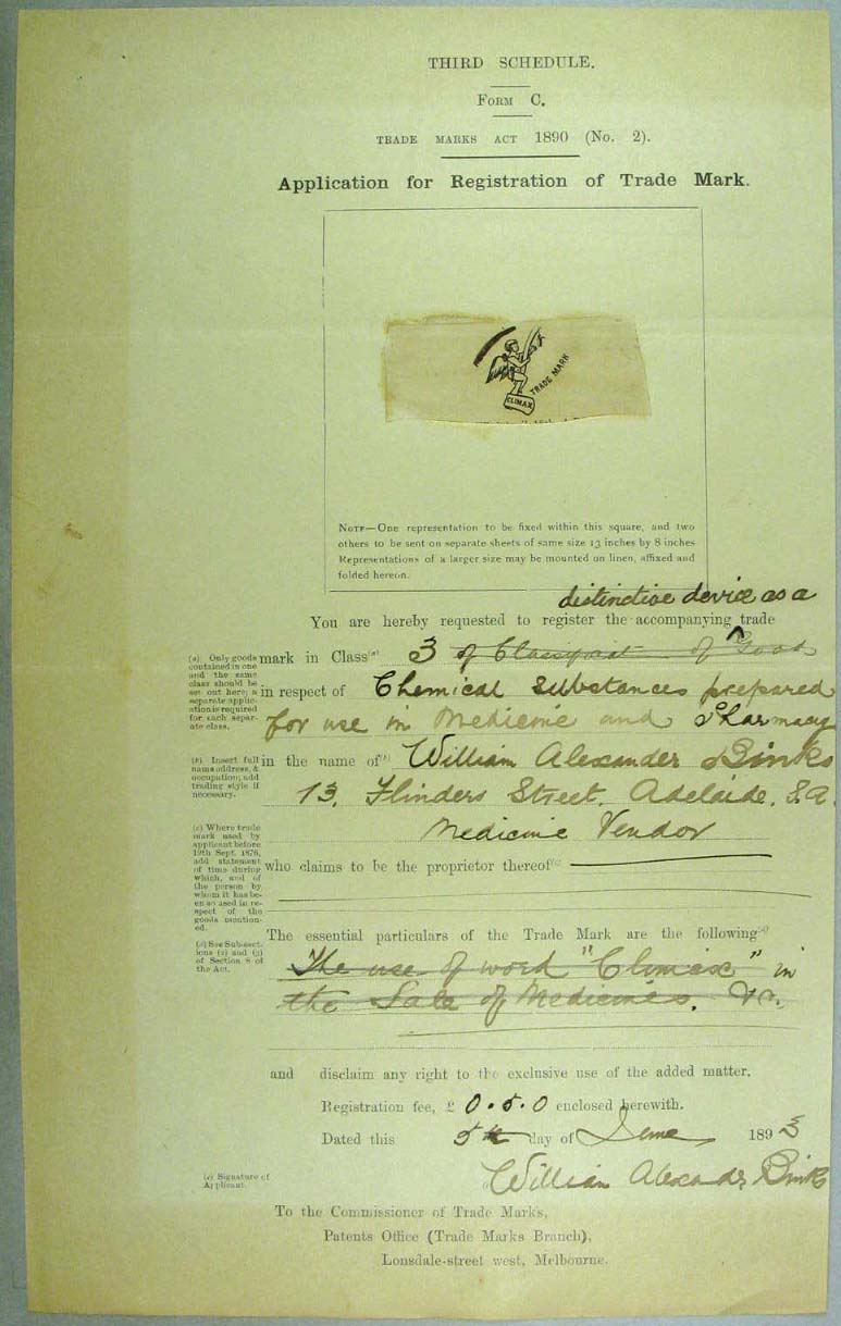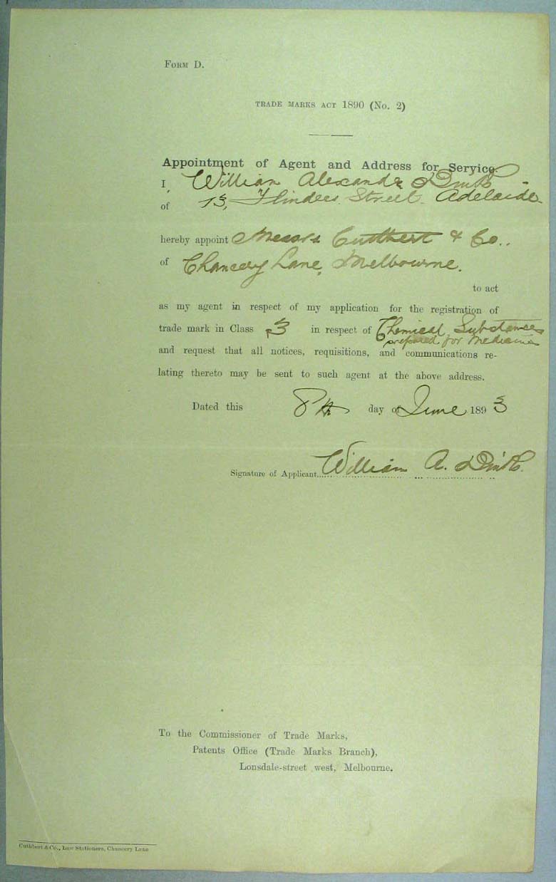 On June 6, 1893 William lodged an application for a patent on a trade mark emblem for use in respect of "chemical substances for use in medicine and pharmacy". (See images below). In the documents he is described as a 'Medicine Vendor' operating at 13 Flinders Street, Adelaide, South Australia.